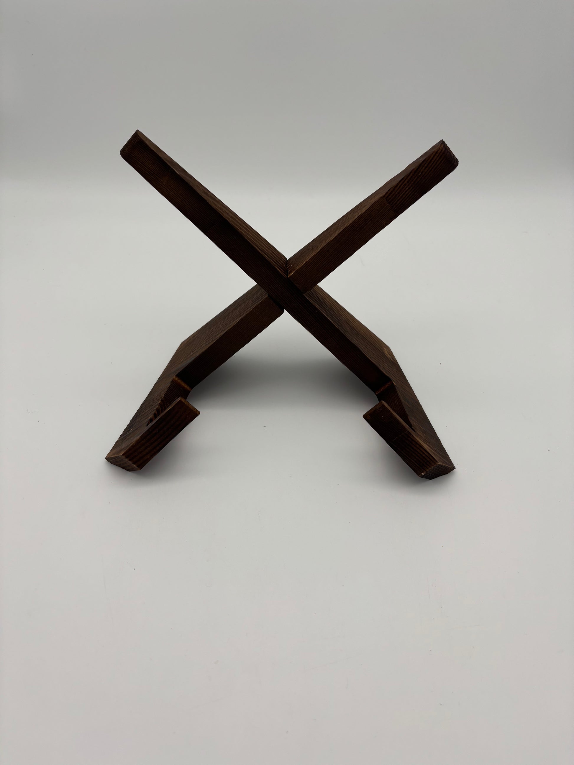 This is a 2 piece wood stand with a very solid base. The glass art will tilt back slightly.