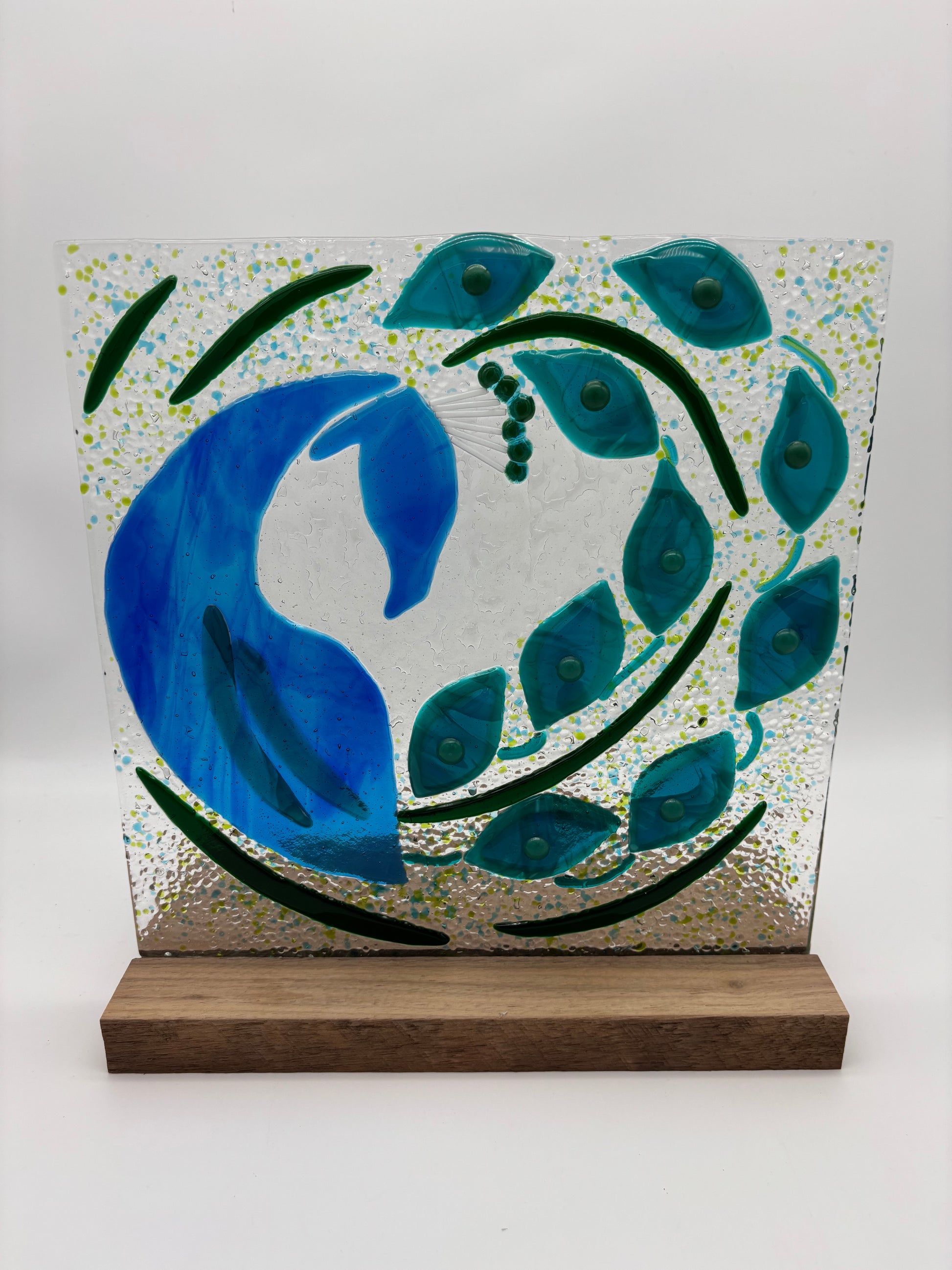 10 x 10 inch peacock in blues and aquas. a variety of stands available to display this piece. Stand not included in price.