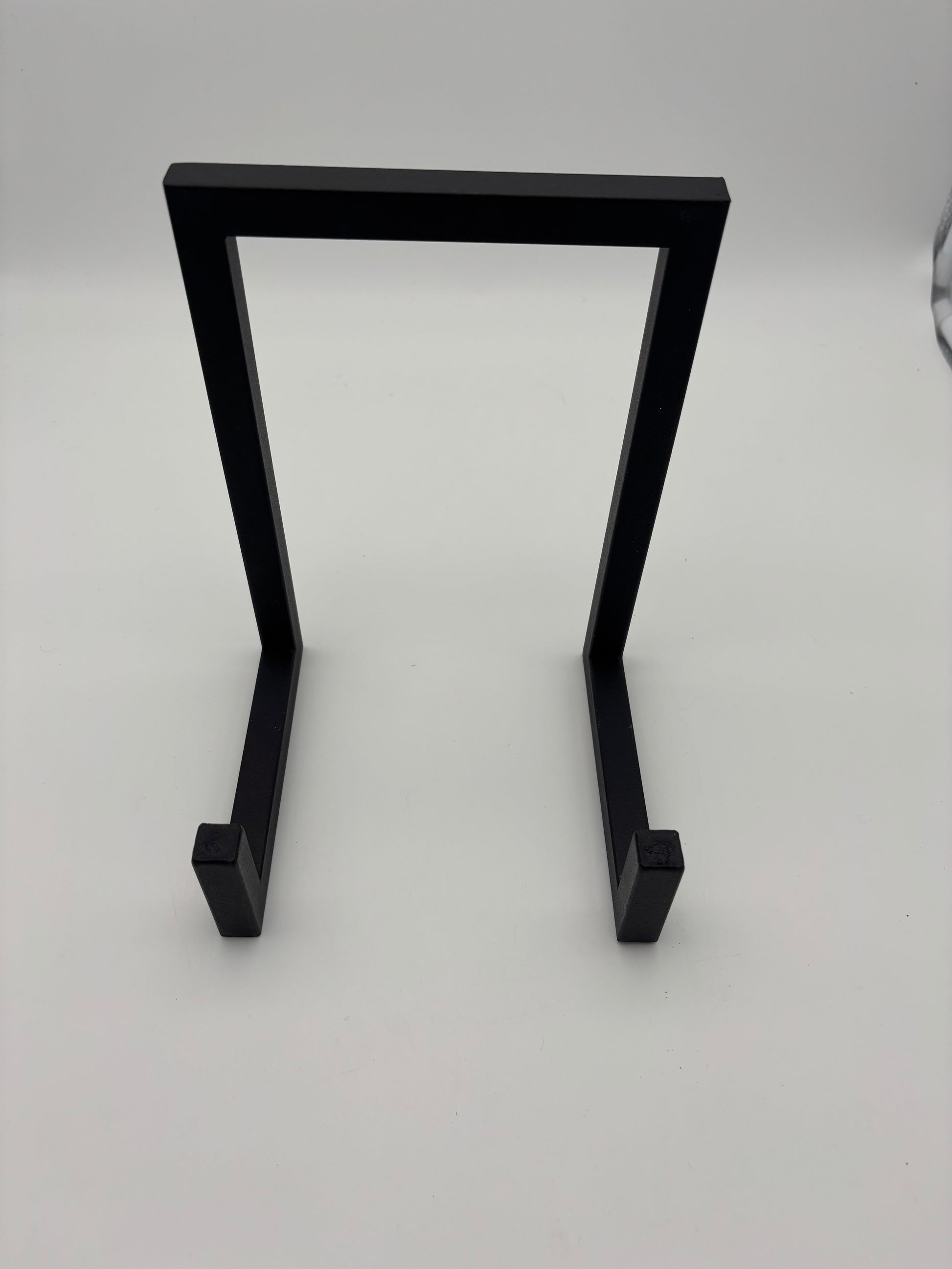 This metal stand is similar to a plate stand and the glass art will tilt back slightly. This stand is good for items displayed in a low volume/activity area.