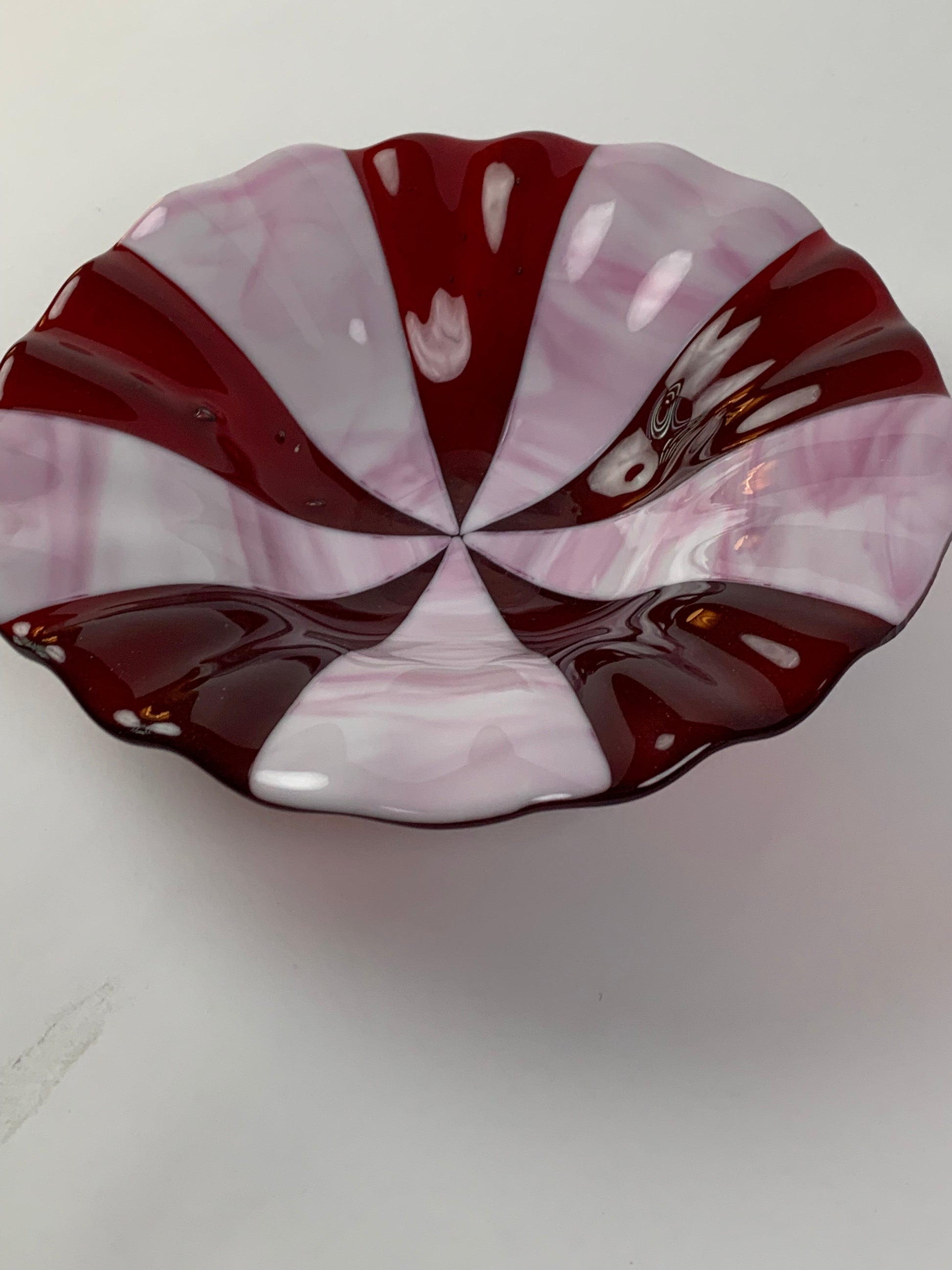 Red and pink bowl with scalloped edges. 10 inches in diameter.